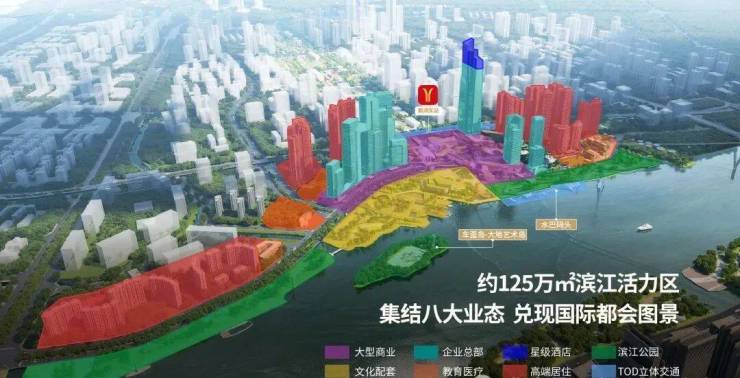 约125万㎡滨江综合体,稀缺顶级大体量华宅,8大业态城市综合体,规划有大型商业,企业总部,星级酒店,滨江公园,文化艺术中心,教育医疗配套,高端居住及TOD立体交通于一体。