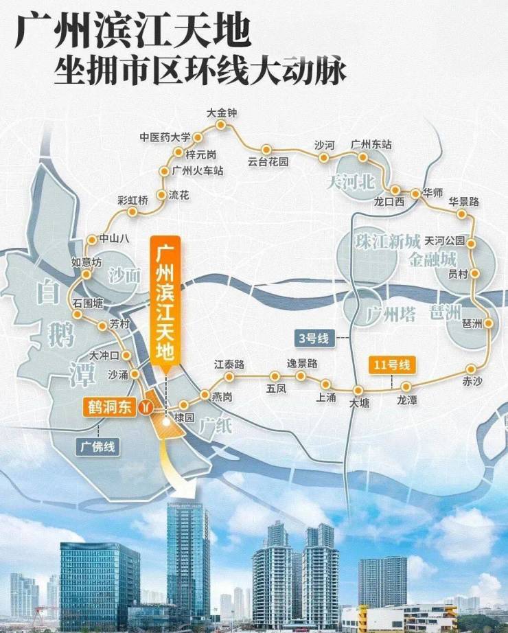 广州11号线鹤洞东站地铁上盖,拥有3横2纵大路网+公交站场+水上巴士,集水、陆、轨等多维交通方式于一体,半小时城央生活圈,1小时湾区生活圈。