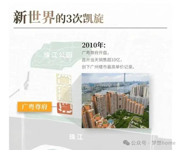 2010年,凯旋新世界广粤尊府首开,当天销售超10亿,一举创下广州楼市的最高单价记录。也正是这一年,广州楼价达到历史巅峰,涨幅为38%。