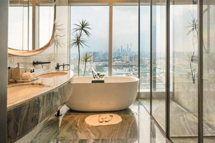 此外,地板、背景墙等,还巧妙运用了奢石、水晶、皮革等天然、高质感的用料,既与窗外的景观形成更好地呼应,又处处显露着奢华而不张扬的审美品位。