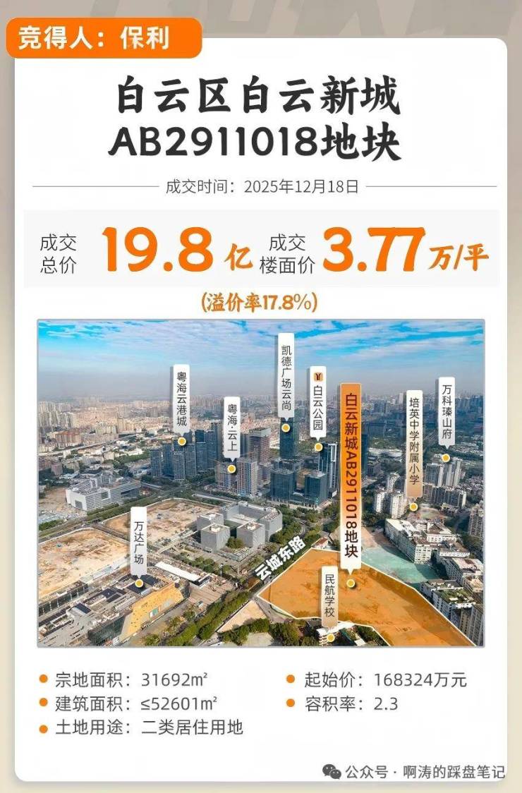 溢价17.82%,保利拿下白云区云城东路东侧地块(白云新城AB2911018地块),总价19.8亿,楼面价3.77万/平。(未扣除配建,按总建面计算)