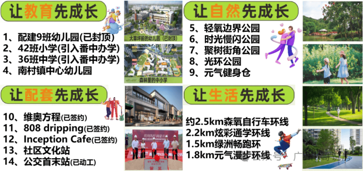 项目配建42班小学+36班中学的九年制学校,引进番禺中学教育集团办学,已开学。