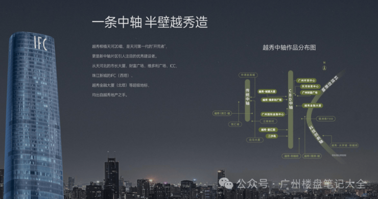 越秀地产 40 余载与广州共成长,在广州打造超150个住宅项目,拥有超40个商业项目,深度参与广州中轴线建设,比如中轴线上西塔、越秀金融大厦等地标,为城市转型升级提供助力,成就广州市民美好生活。