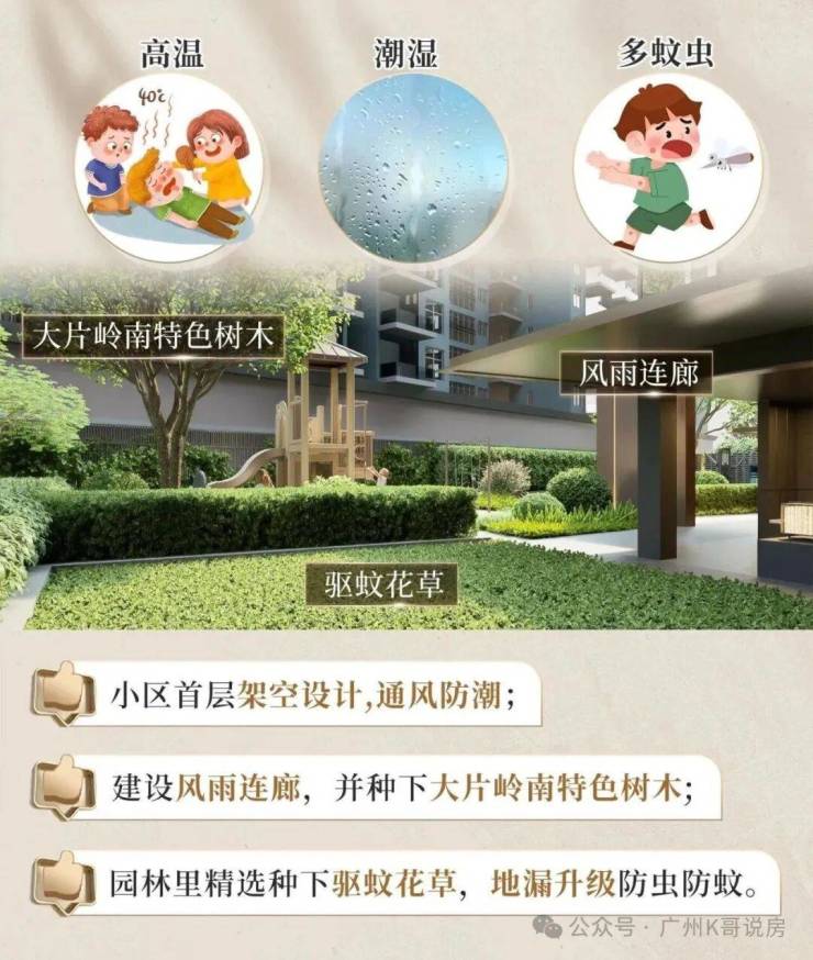 针对广州回南天的气候特色,小区首层做了立体架空设计,通风防潮;