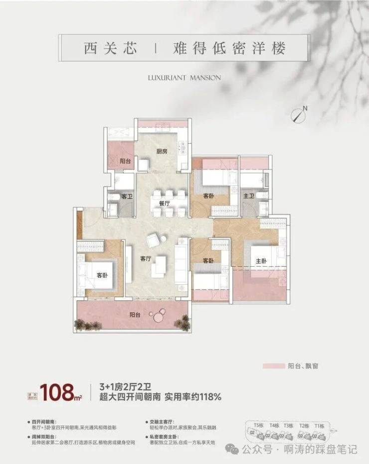 主力户型约108平四房,做到了四开间朝南,其中三间卧室都是南向。这当中,主卧套房独占东南侧单边位,通风和采光都明显占优。