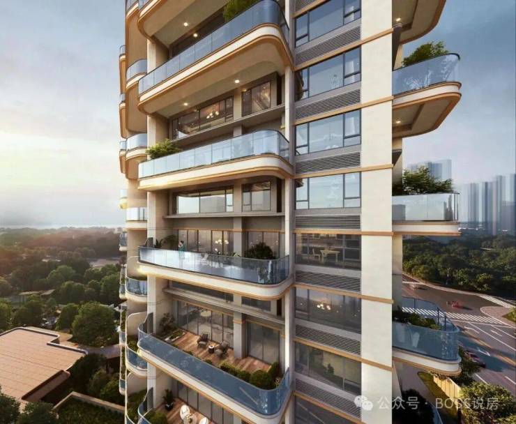 立面美学:以典雅的弧形线条,搭配大面积蓝灰玻璃和深灰涂料造型,先锋审美,高窗地比,打破建筑内外的视野界限,室内最大化与景观面合一,打造横沥岛地标四代宅;