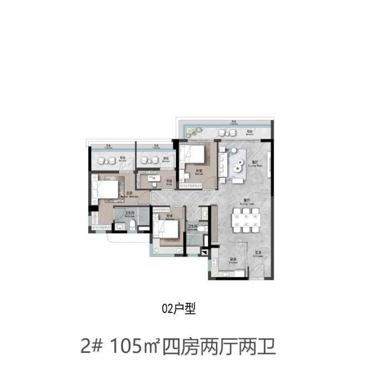125㎡四房在舒适性上进一步提升,四开间朝南,阳台长度达到6米,连接客厅与次卧,主卧配备独立衣帽间和干湿分离卫生间,动静分区清晰,适合改善家庭 。