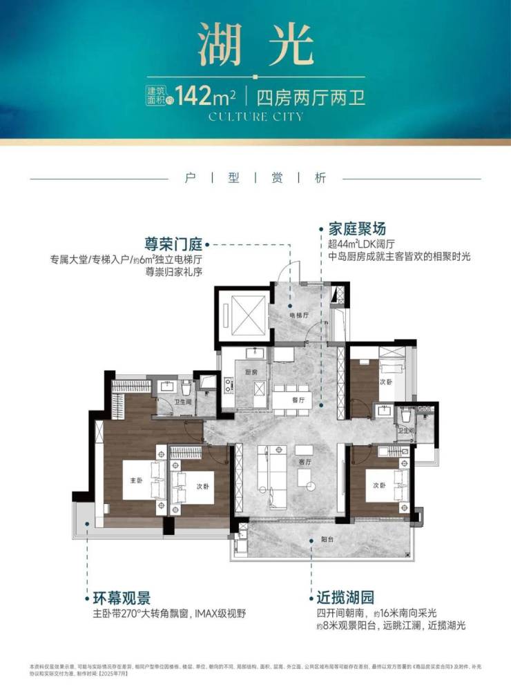 约142㎡户型开始其私密性就更高了,户内尺度更大之余,还拥有专梯入户和独属大堂配置,主卧升级至带270°大飘窗,仪式感真的向豪宅看齐。