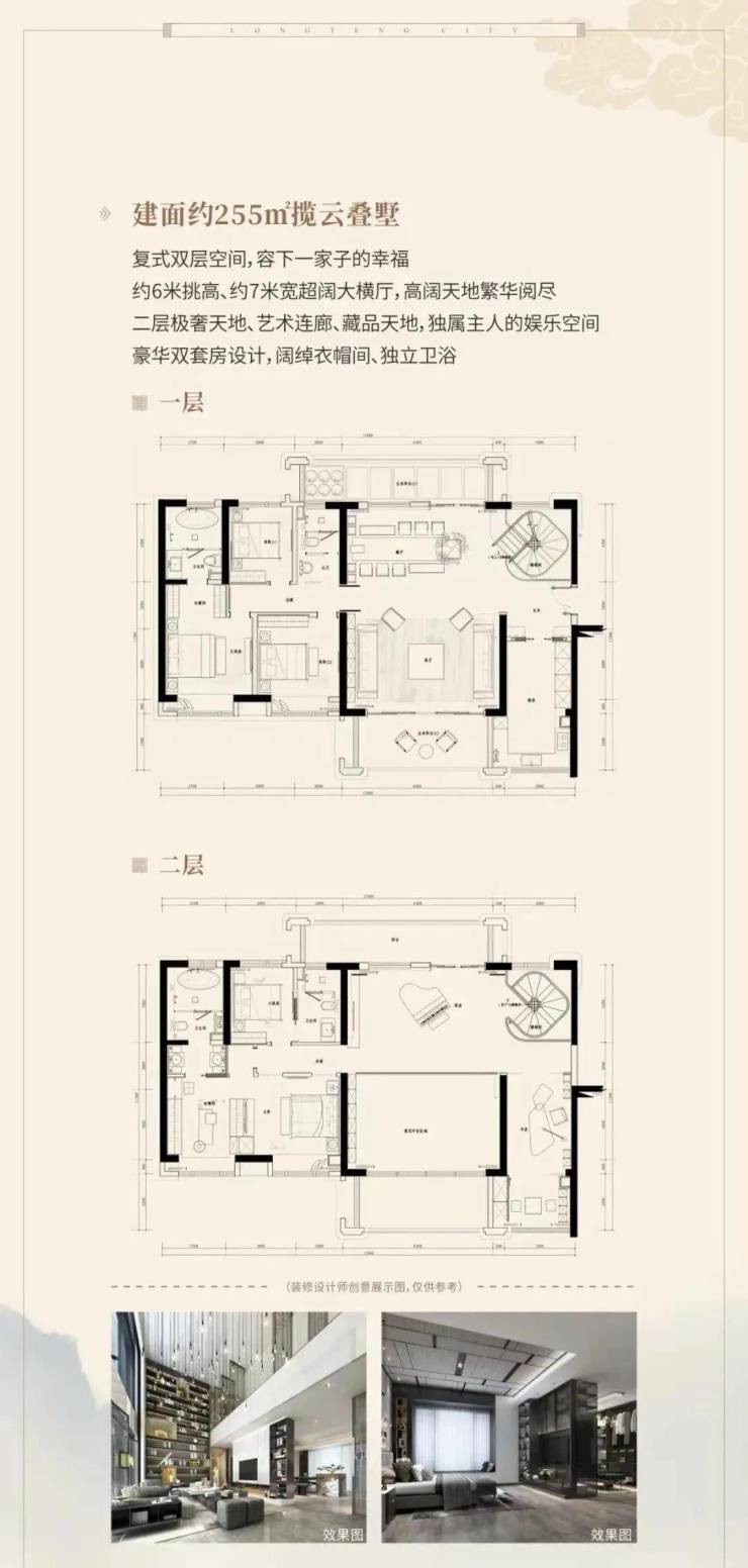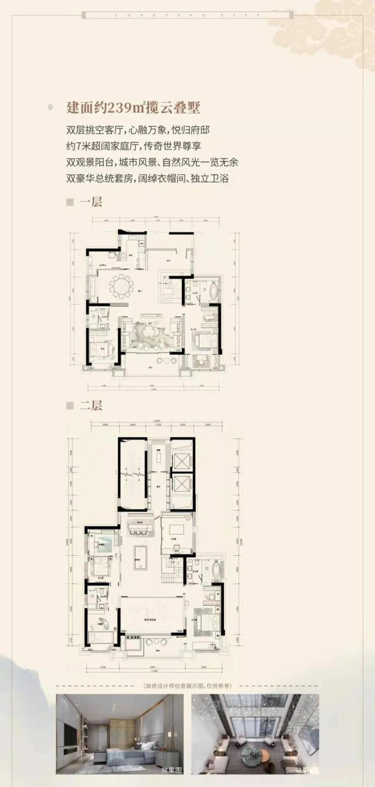 建面约440-837㎡国风院墅(总价约800万-2500万/套),建面约239-255㎡揽云叠墅(总价约500万-600万/套)
