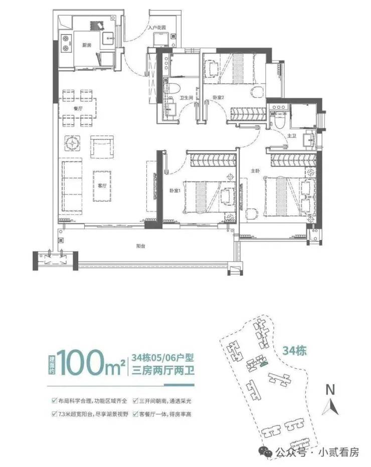 此次广地花园·观灏加推的新品34栋悦景楼座,面积段分别为86m²、96m²、100m²悦景三房,多面采景,三面望水,通透采光,充分利用户型的每一寸肌理,以有限的生活空间焕发更多生活灵感,打造全方位人性化居所。