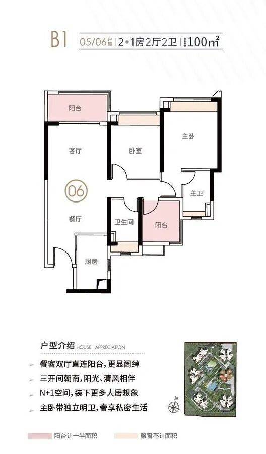 此外,建面约100㎡2+1房2厅2卫,做到了三开间朝南,整体更为开阔。