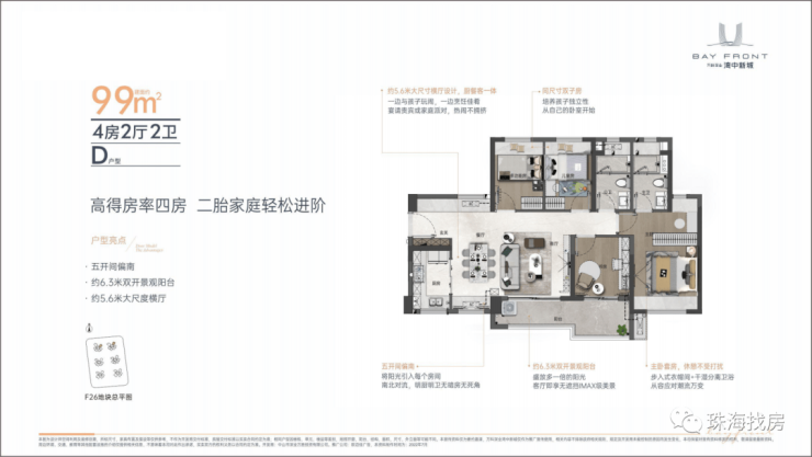 建面约99m² 四房两厅两卫,超高得房率,是二胎家庭的进阶之选。约5.6m大尺度横厅,让朋友聚会或家庭派对,热闹而不拥挤。