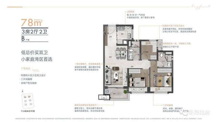 建面约78m² 三房两厅两卫,同等面积多出一卫。三开间偏南,还是建面约78m² 可实现套房设计的罕见户型,南向主卧带套间,而公卫干湿分离更是贴心,设计非常人性化。