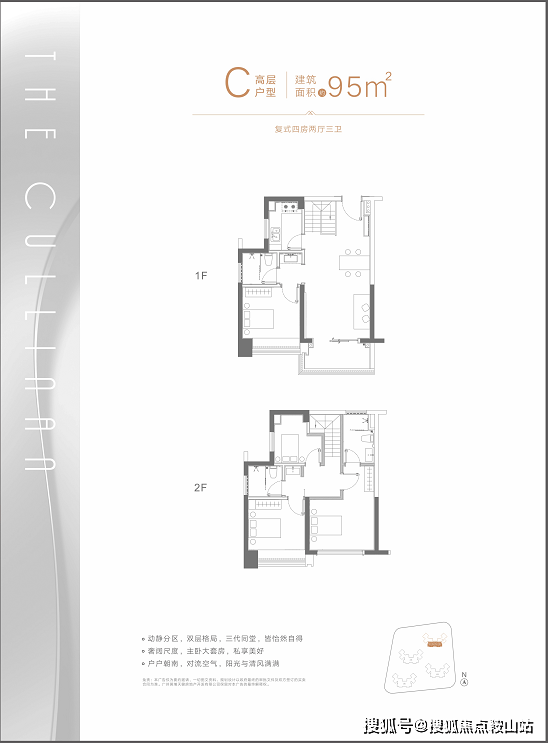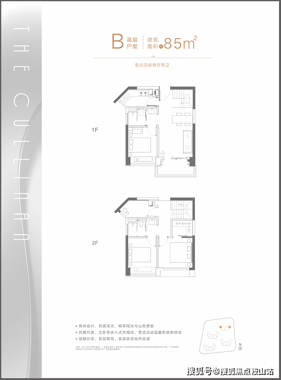 总建筑面积约10.6万㎡,设有4栋高层复式洋房,建面为85-120㎡,采用错式排布,全南向设计,通风采光俱佳,带精装交楼。