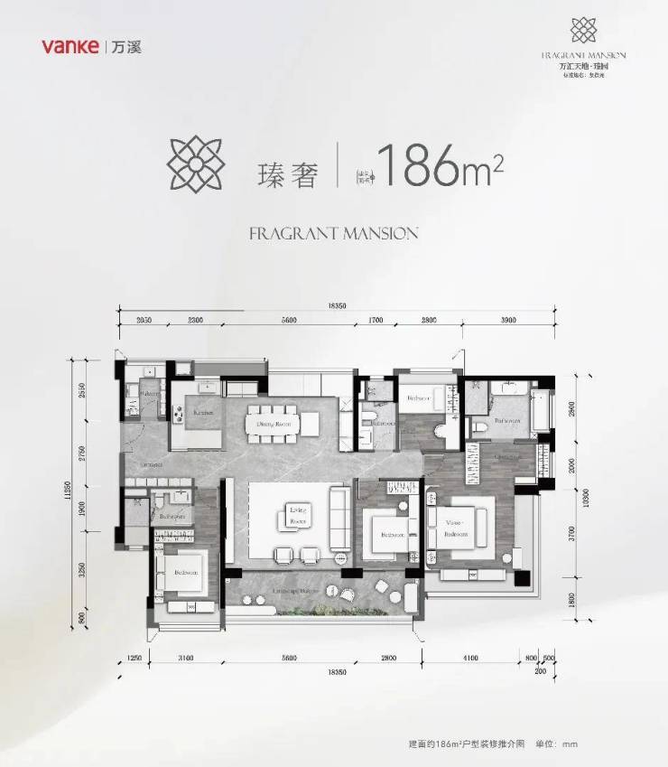 建面约 186m² 4 房 + 2 厅 3 卫 + 灵动空间,正南向 01、02 户型一线花地湾河涌景观视野,全明四开间朝南,约 18.3 米极致奢幕视野,LDKB 洄游路线,多功能巨幕宽厅,多功能岛台,端厅套房主卧