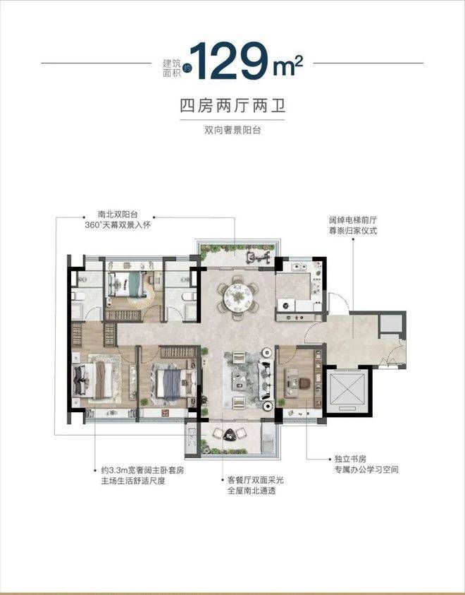 项目为低密度围合式小区,在售 106㎡、129㎡、168㎡三种四房户型,精装修交付。106㎡四房四开间朝南,带入户花园;129㎡四房有 U 型厨房、约 6.3 米大阳台;168㎡四房三卫有双主卧套房等。作为纯改善项目,产品设计贴合改善需求,品质较高。