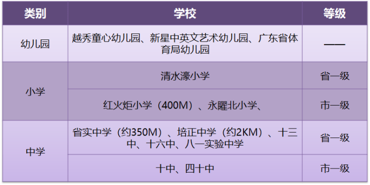 周边名校环绕,清水濠小学(省一级),广州老牌名校红火炬小学(创办于20 世纪40年代历史底蕴丰厚),中学覆盖省实、16中、培正、八一实验等多家省级名校。
