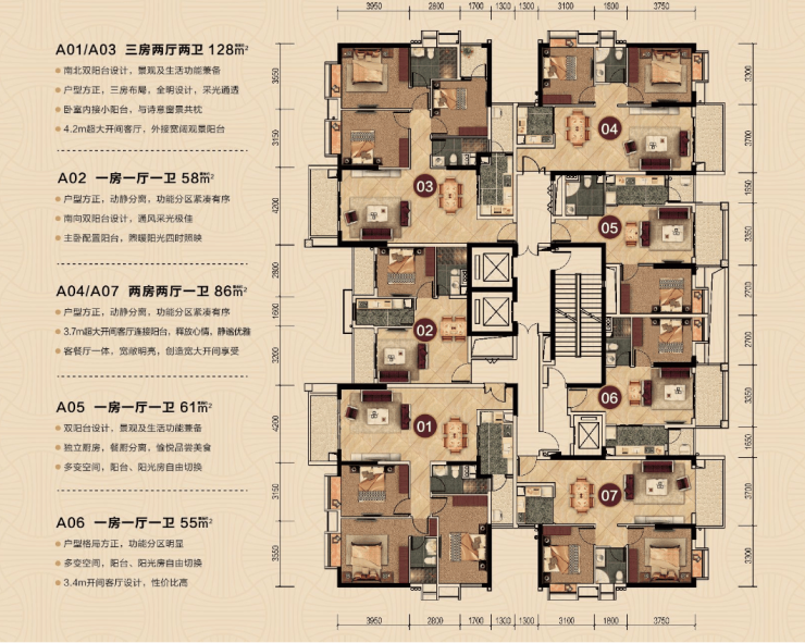 越秀老城核心极为实用的建面约55㎡~169㎡三至四房,户户享极宽阳台;动静、干湿区域布局合理;房间大面积开窗设计,房间设计大飘窗/阳台,户型通风采光无暗房。