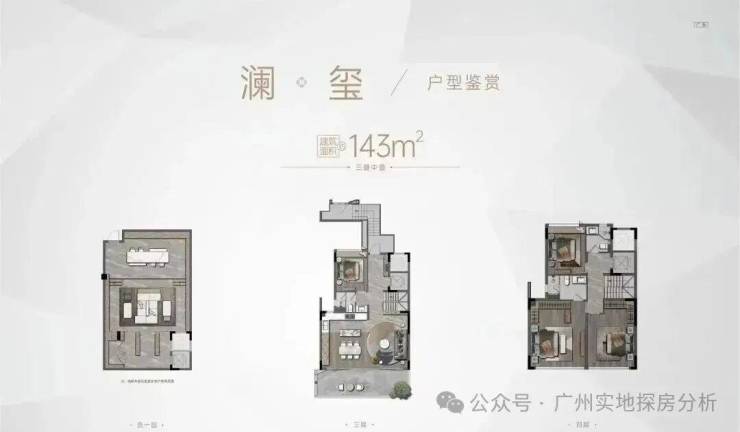 项目楼栋分布和户型:项目除了4栋R1-R4栋政府配建房以外,对外销售的产品涵盖叠墅、小高层和高层,户型建面均为143㎡。中间一线临湖区由18栋4-6层的叠墅组成一梯一户,合计188套;右侧为2栋9层高的小洋房,两梯两户,都是独门独户。同时还有4栋保障性住房,左边是2栋16-17层的小高层,两梯四户。