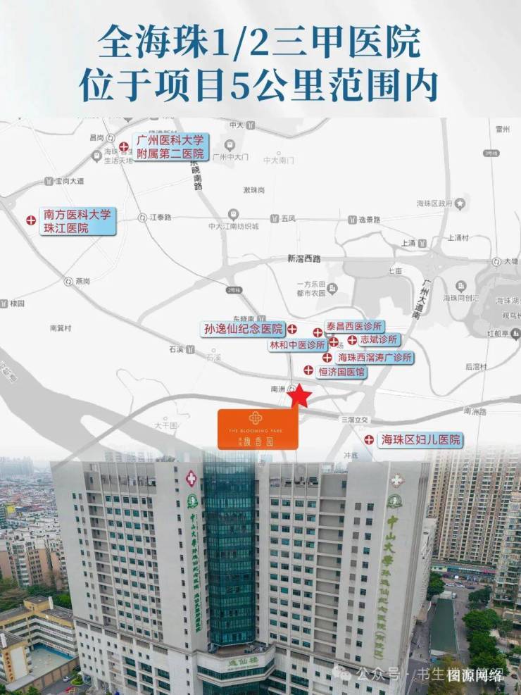 约750米中山大学孙逸仙纪念医院(三甲)约1.5公里海珠区妇儿医院约3.5公里南方医科大学珠江医院、广州医科大学附属第二医院。