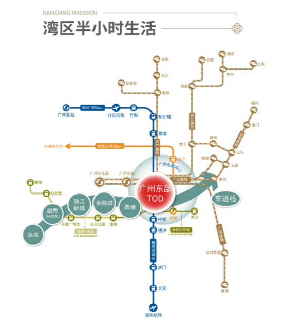 ·依托广州东部TOD(距离4公里)汇聚5地铁、3铁路、2城际等10轨交汇,实现1站速达黄埔,打造“半小时湾区生活圈”