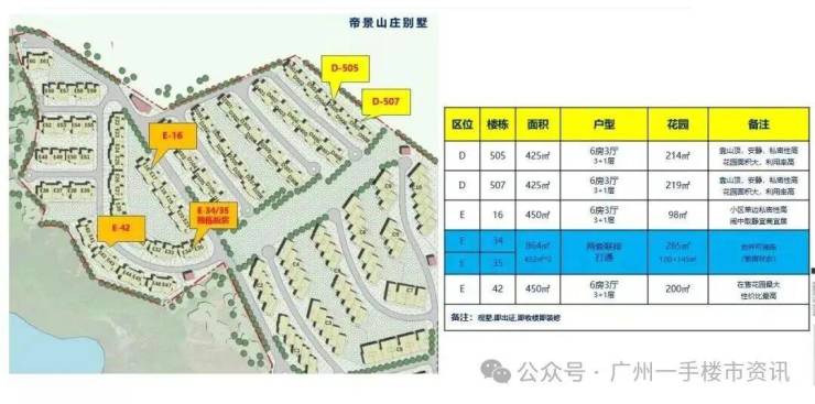 合生帝景山庄别墅地势北高南低依山而建,规划建设为天河大型都市半山生态别墅社区,整个项目分为A、B、C、D、E五个组团共218套别墅。其中A、B、C三个别墅组团早已全部售罄,目前整个项目只有最新的D、E两个别墅组团还有少量双拼别墅可售。