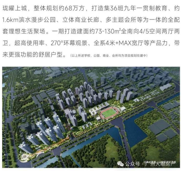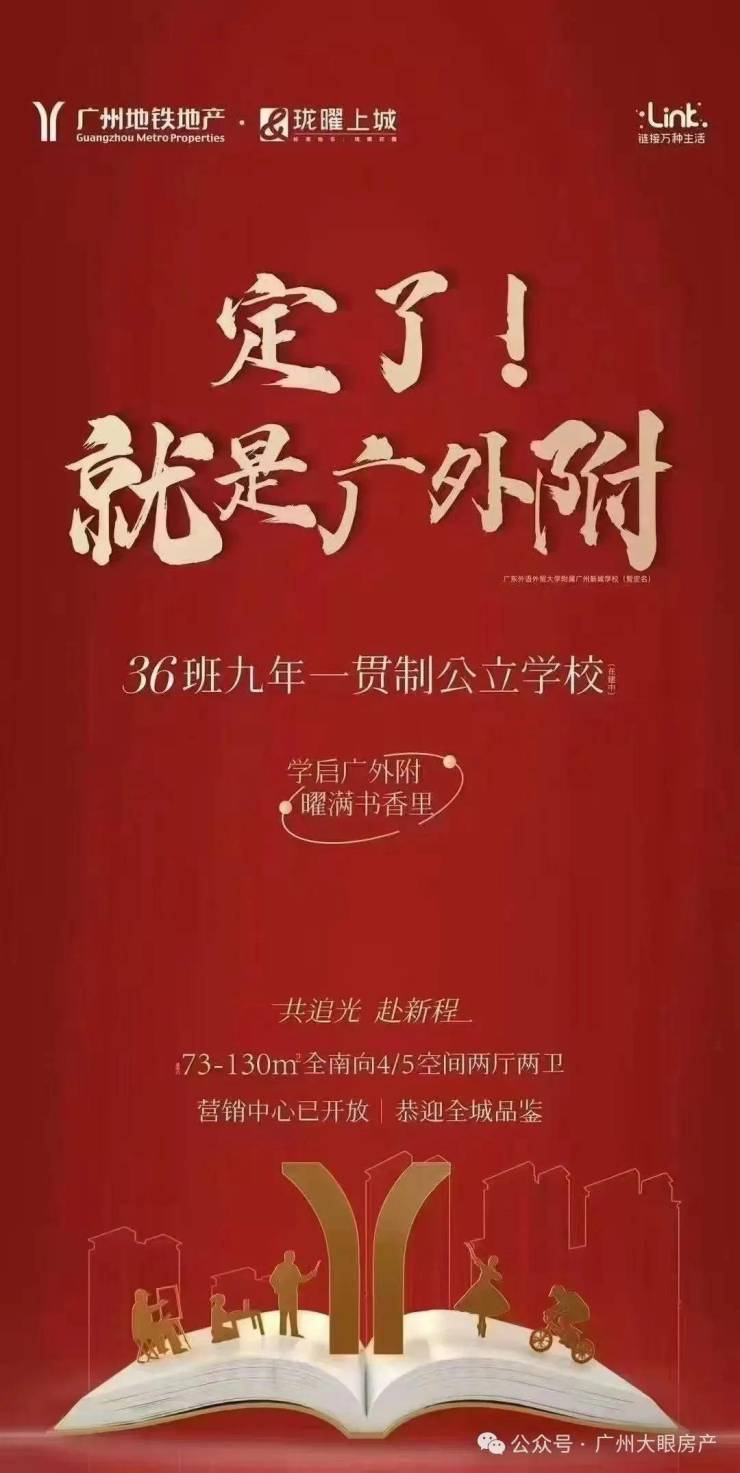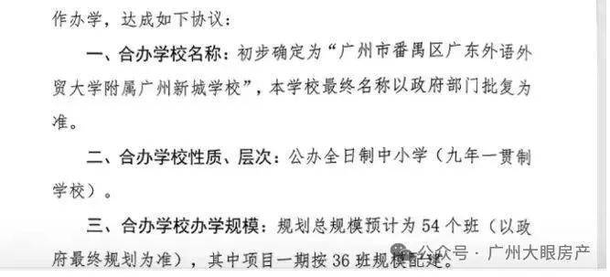 目前广州地铁地产·珑曜上城配建的广东外语外贸大学附属广州新城学校,学校总规模预计为54班,其中一期按36班规模建设,是一所九年一贯制学校,小升初明确。