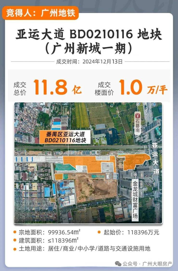 去年12月,广州新城停车场一期地块(亚运大道BD0210116地块)被广州地铁地产以底价118396万元拿下,楼面价约为1万/平(未扣除配建)。