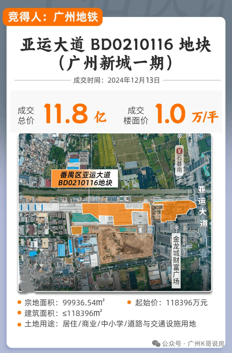2024年12月广州地铁拍下亚运大道BD0210116地块(广州新城一期),折合拿地价不过1万/㎡。
