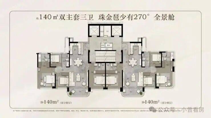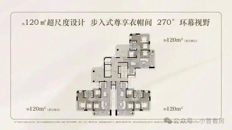 120㎡四房,采用 270° 弧形落地窗设计,主卧套间配备独立衣帽间,实际使用率超 105%,剩余房源集中在中低楼层。