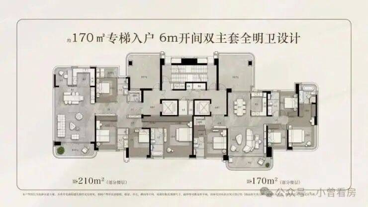 210㎡四房为专梯专户布局,15.8 米南向采光面保证全景视野,得房率超过 125%,剩余房源以中间楼层为主。
