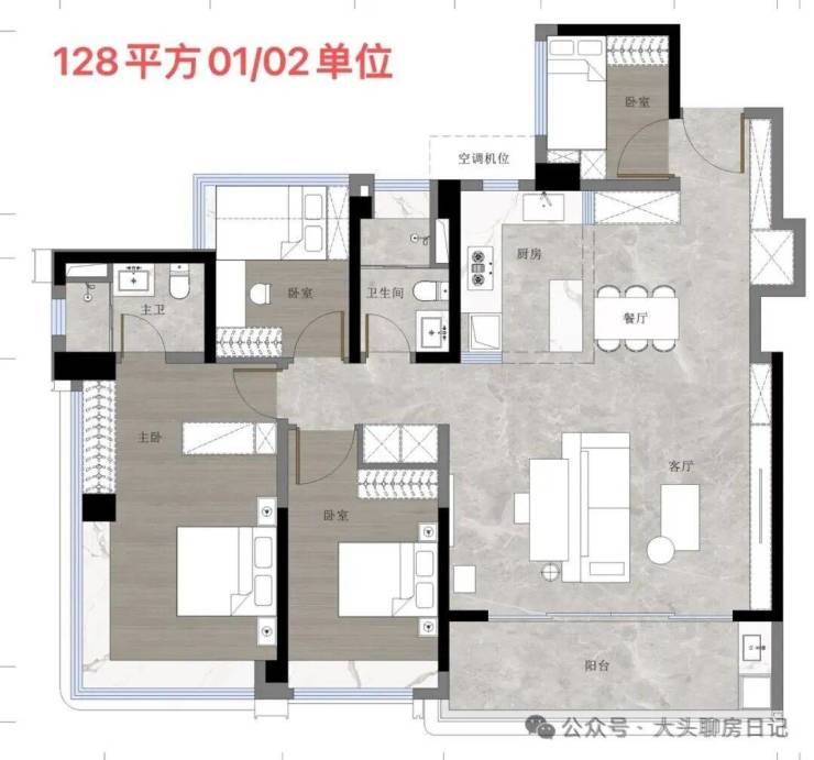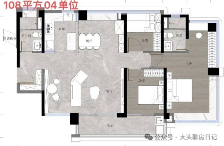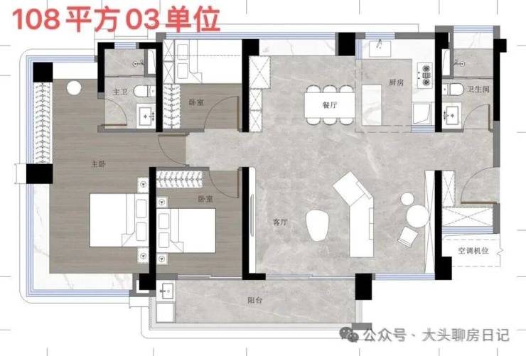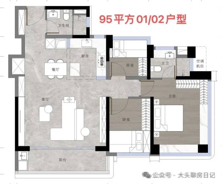 108㎡3+1房位于1、2栋朝向和景观相对较好的梯腿,属于95㎡的进阶。