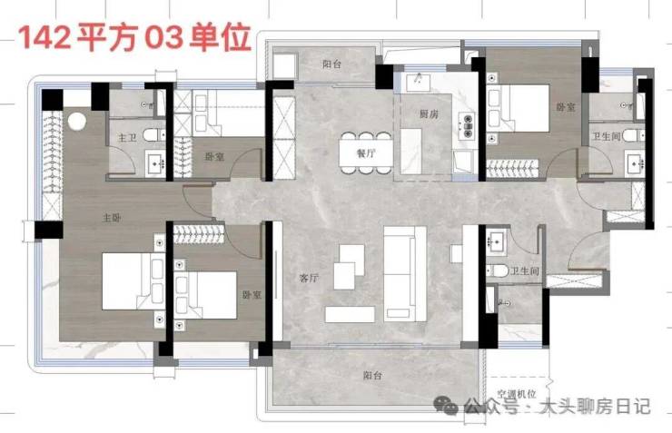 79平也是南向,其中改善108-128-142都是三梯四户的超高层楼栋,新规户型使用率超100%,全南向优景,户户都有大阳台,而且每一户的主卧室都是240度的窗景,这一点,确实蛮牛的。