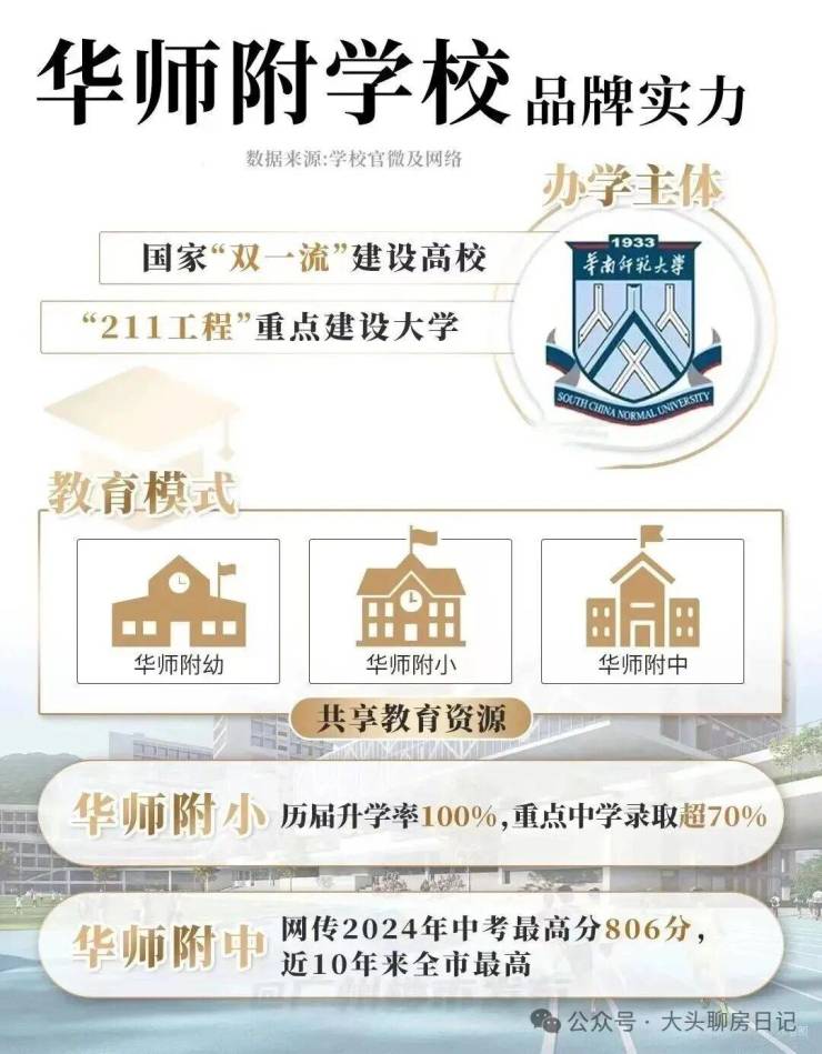 华师附是华南师范大学附属学校,该校是双一流、首批国家211工程大学,有强大的教育背景和资源。华师附小升学率100%,重点中学录取率超70%;
