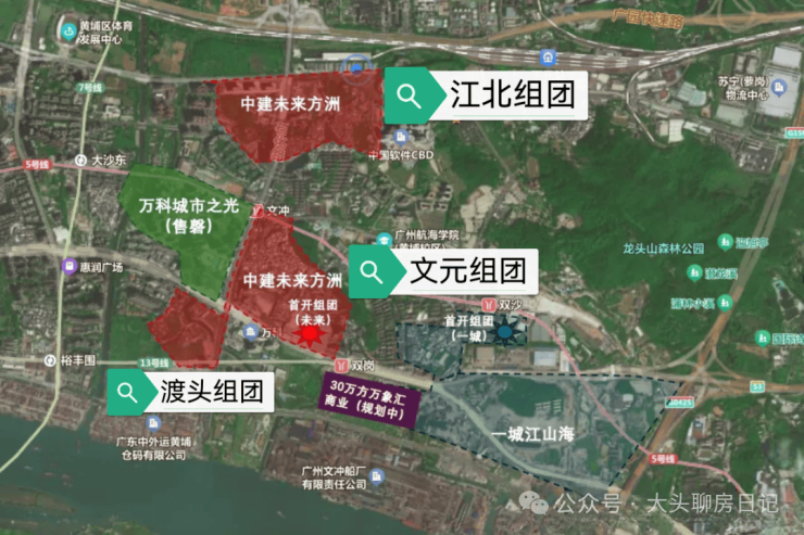 其中,江北组团沿石化路分布,毗邻地铁5号线文冲站,不用换乘即可直达珠江新城。