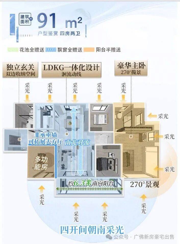 新规产品,广州首创“零飘窗”产品,将空间发挥极致,建面约77-91㎡三四房,全双卫设计,打造南北通透低密精奢小户,真正做到高赠送高使用