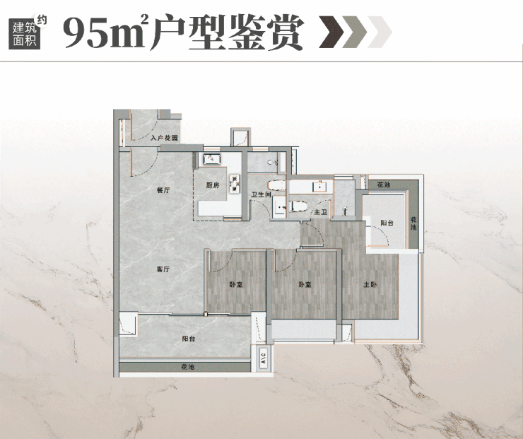 建面95平三房,带入户花园,该户型做到了动静分离,全屋采光面近19米。