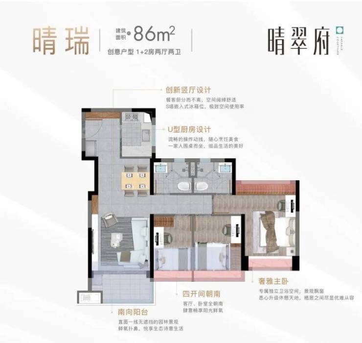 小户型四面宽、双卫生间、S墙冰箱位设计