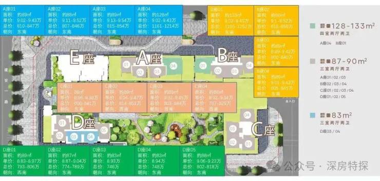 项目在售建面89-133㎡三至四房,全南向板楼设计,通风采光佳;建面89㎡三房两厅两卫,人生第一套房不必迁就;建面128-133㎡四房两厅两卫,阔绰奢宅,三代同堂的进阶之选,玖玖颂阁占地约1.4万㎡,建面约10.41万㎡,目前在售89㎡3房/128㎡4房。项目由5栋组成,E座为公租房,A~B-C座2梯4户,D座2梯5户, D座有部分回迁房,可售楼层为3-13层。