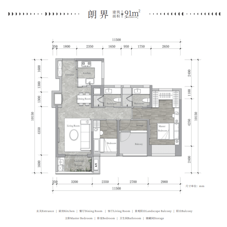 建面约91㎡ 2房2厅2卫+1灵动空间: