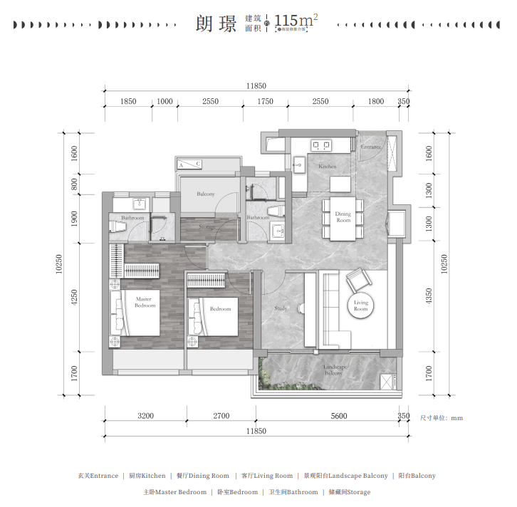 建面约115㎡ 2房2厅2卫+2灵动空间: