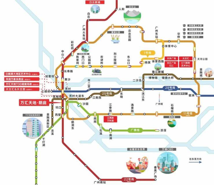 交通便利:项目直线距离地铁1号线花地湾站仅500米,未来还将有15条城市/城际轨道交汇,无缝链接大湾区,出行高效便捷。