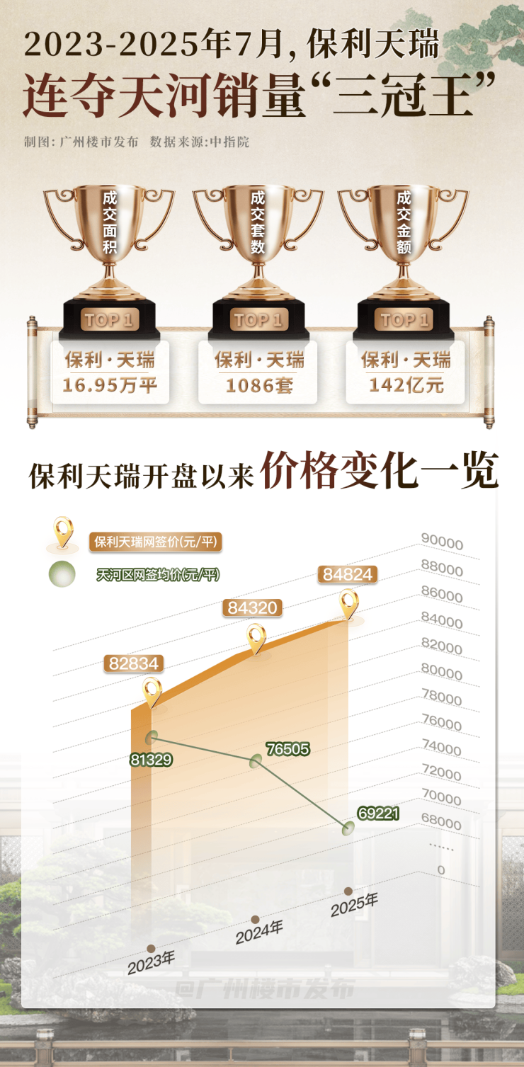 保利天瑞新房价格稳中有升,自2023年至今始终保持天河销量、网签面积及成交金额的领先地位,稳居区域销冠。