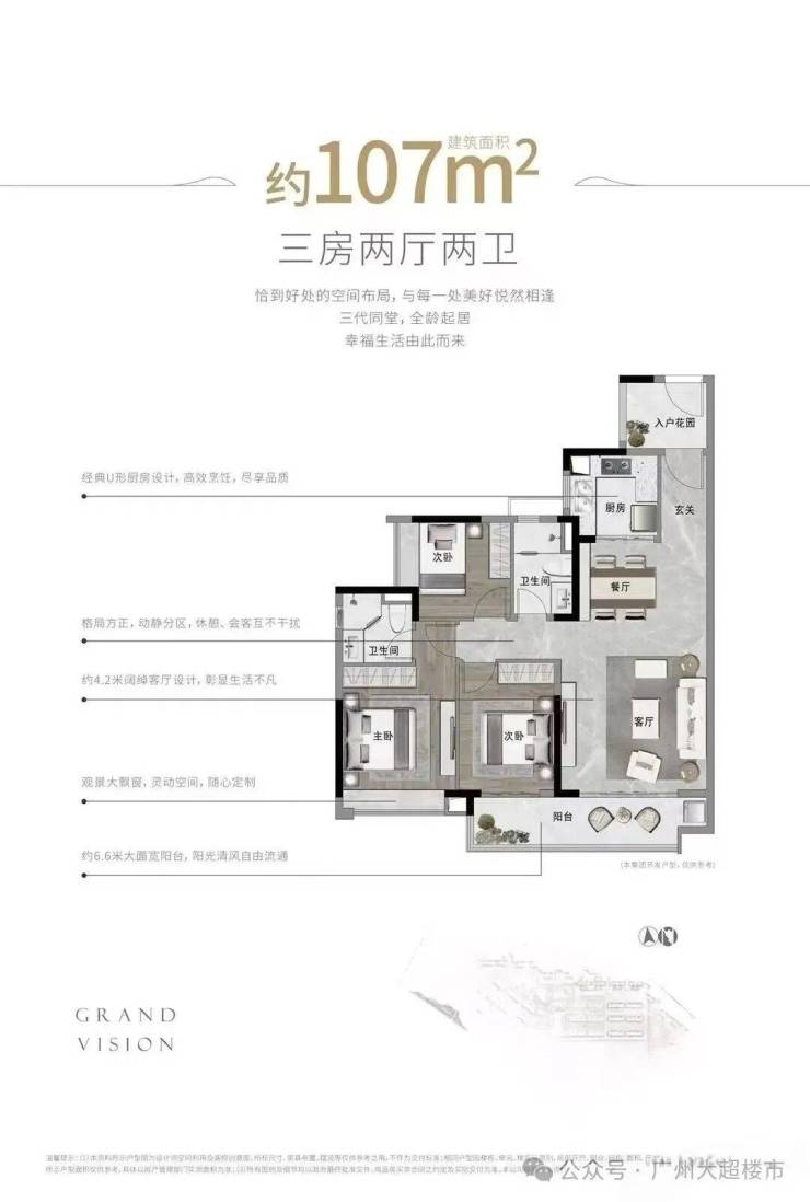 舒适阳光三房 107㎡三房两厅两卫,约6.6米大面宽阳台,阳光清风入室约4.2米阔绰客厅,更多共聚空间,大尺寸主卧套房,观景大飘窗空间随心定制