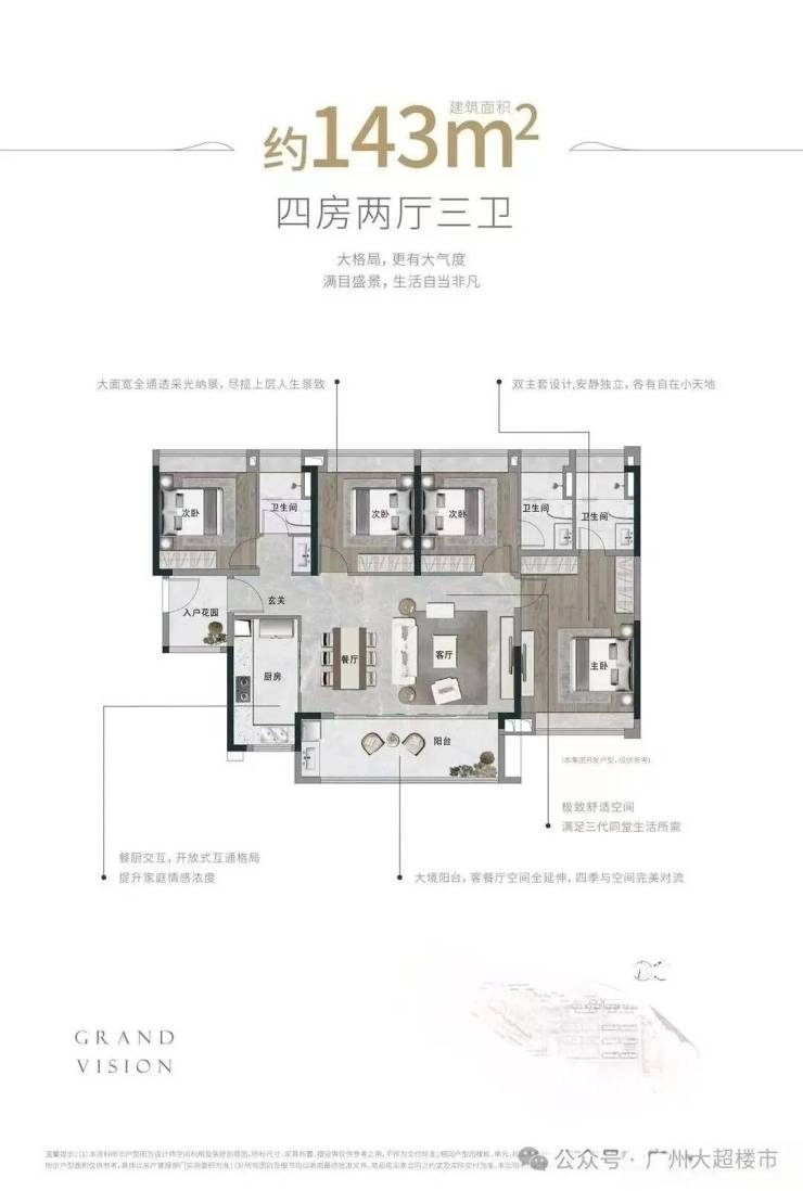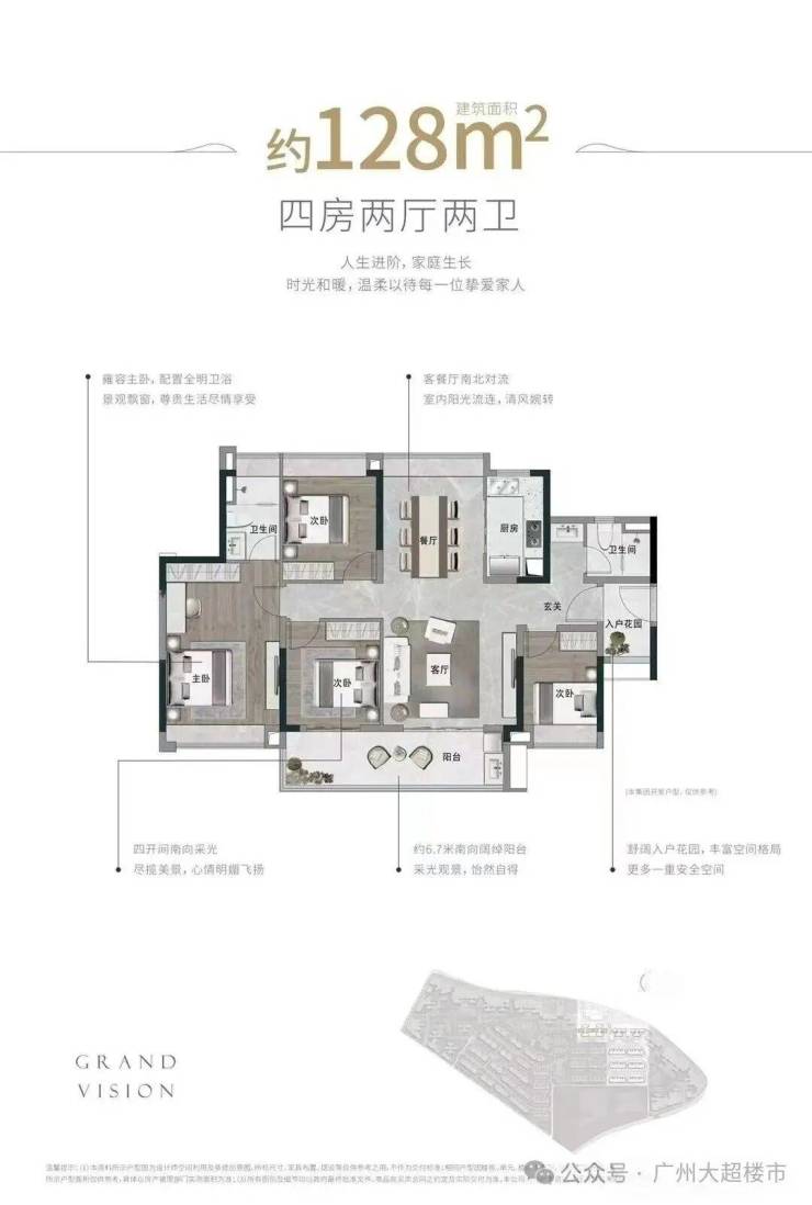 奢阔进阶大四房 128㎡四房两厅两卫,约6.7米南向阔绰阳台,采光观景怡然自得,四开间南向采光,南北对流,阳光流连,舒适入户花园,多一重收纳、安全空间,雍容主卧全明位于,尊享生活享受。