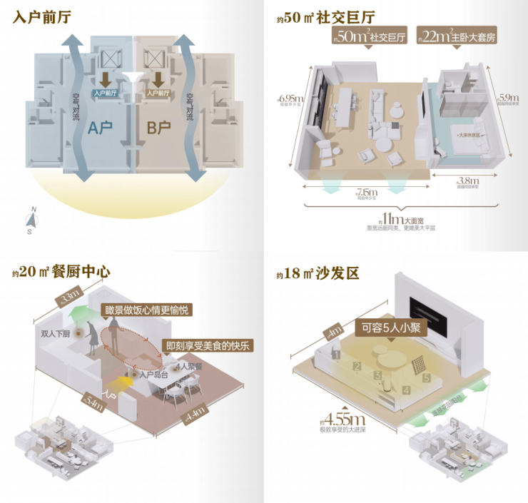 餐客厅一体化设计动线流畅,加上市面上相近户型少有的面宽约5.8m超阔横厅,将空间感无限放大。