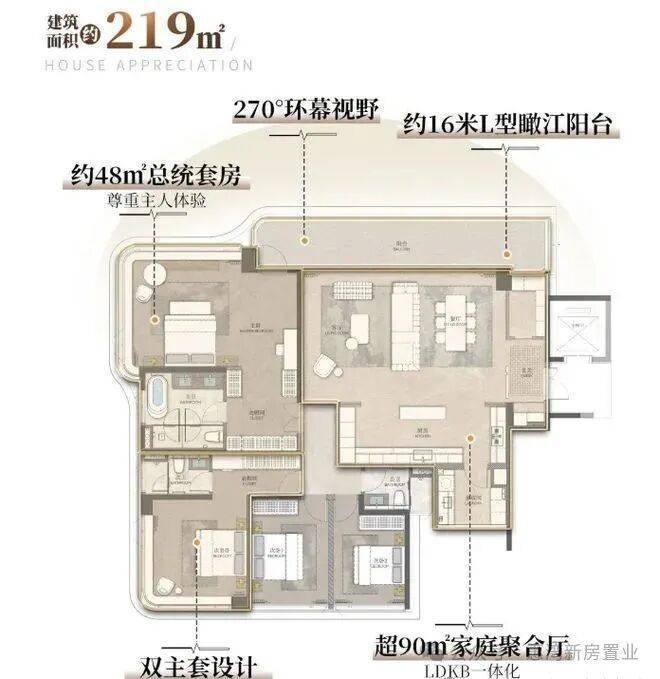 能建・天誉府在售面积为 128 - 219㎡的新规大宅,使用率约 102% 。部分户型主卧北向望江,西面阳光补充,开间可达约 6.8 米,拥有超 28㎡的超级主套,空间十分舒展。像建面约 219㎡户型,有约 16 米 L 型阳台,270° 环幕观江,前排约 300 米无遮挡,江景与城市图景尽收眼底。