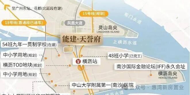 项目直达距离横沥站(15/18/32号线三地铁交汇)约400米,其中18号线已于2021年开通,15号线出现在广州地铁四期的申报目录里面,32号线则是中长期的规划,临近广澳高速、南沙港快速路,可快速到达广州市区、东莞、佛山、中山等城市,交通十分便利。