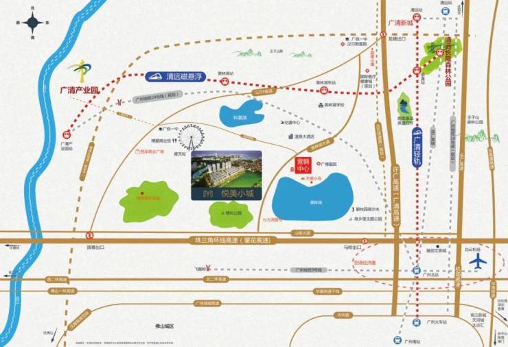 目前正在建设中的清远磁悬轨专列直通楼盘所在的美林湖国际社区,并在片区内设置了美林湖和美林湖东站两个站点。据百度地图显示,楼盘距离广清城轨银盏站约11公里,可直达清远、广州,并接驳广州地铁。楼盘5公里内有珠三角环线高速、佛清从高速,自驾出行十分方便。