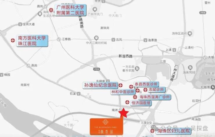 医疗配套的话,项目3公里范围内分布着广州市红十字会医院、海珠区中医医院等多家二甲以上医院,其中广州市红十字会医院作为综合性医院,在心血管、骨科等专科领域具备较强诊疗能力。